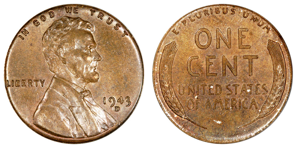 Due to wartime needs of copper for use in ammunition and other military equipment during World War II, the United States Mint researched various ways to limit dependence and meet conservation goals on copper usage. After trying out several substitutes (ranging from other metals to plastics) to replace the then-standard bronze alloy, the one-cent coin was minted in zinc-coated steel. This alloy caused the new coins to be magnetic and 13% lighter. They were struck at all three mints: Philadelphia, Denver, and San Francisco. As with the bronze cents, coins from the latter two sites have respectively “D” and “S” mintmarks below the date.